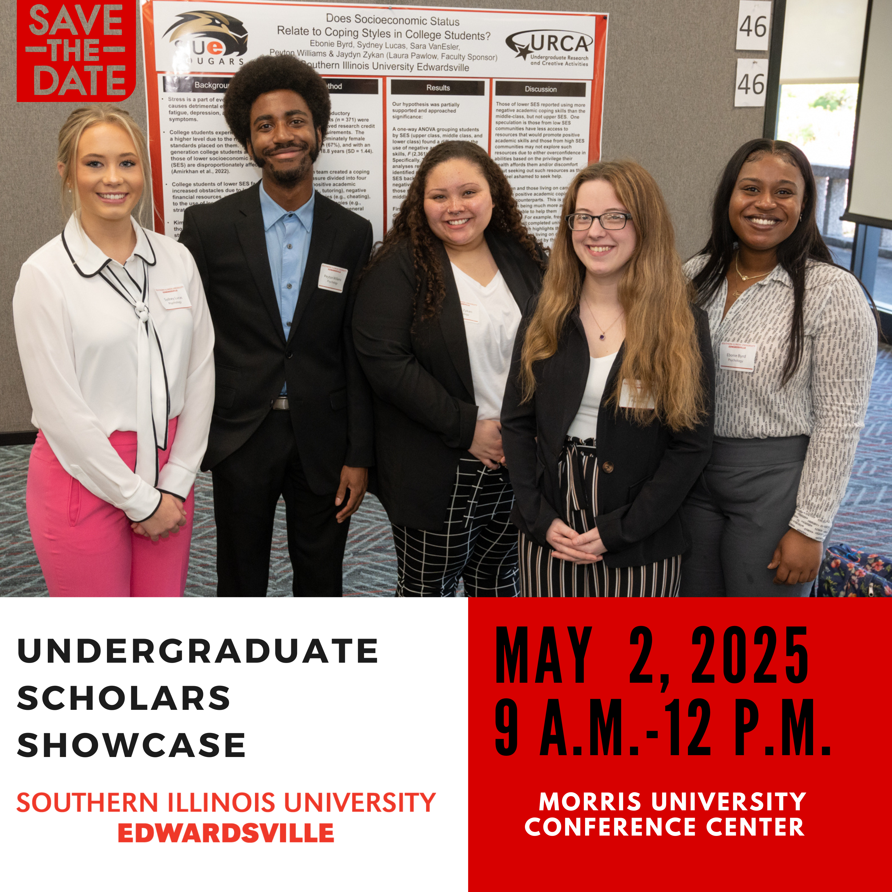 The culminating experience for the Undergraduate Research and Creative Activities Associate Program at SIUE is the annual Symposium (aka the SIUE Undergraduate Scholars Showcase), which is held in April each year. The Symposium is the formal avenue in which all URCA Associates and some URCA Assistants present their work to the University community, their family and friends, and provides an opportunity for these students to "shine" and demonstrate their impressive achievements in the URCA Program.