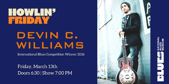 Howlin’ Friday brings acclaimed soul and blues vocalist Devin C. Williams, 2026 International Blues Challenge Winner, to the National Blues Museum for a high-energy night of modern blues, deep soul, and powerful songwriting. Known for his commanding voice and electrifying stage presence, Williams blends traditional blues roots with contemporary soul and funk influences.