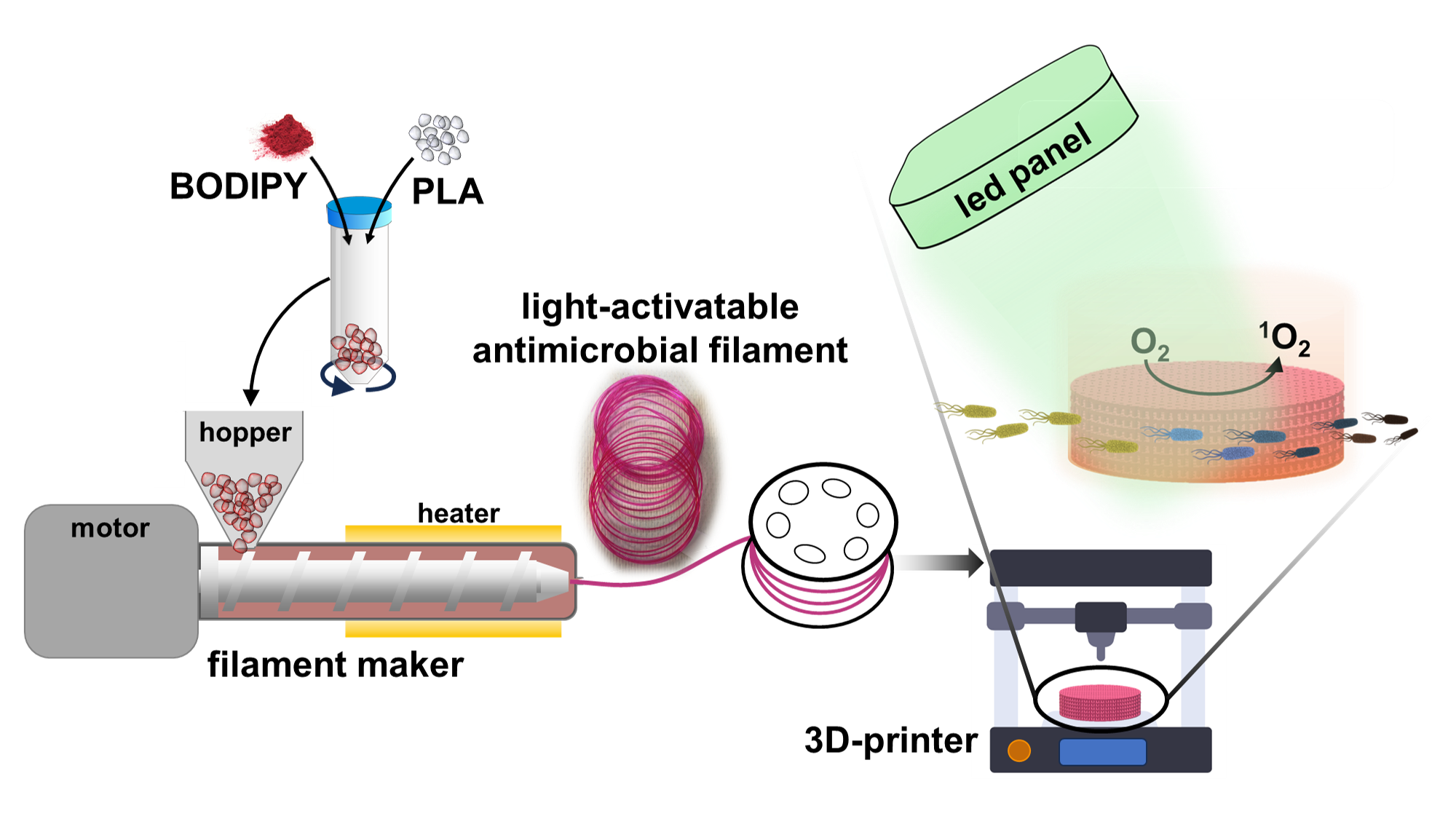 Herein, we introduce an innovative, straightforward, and eco-friendly approach to developing photoactive 3D platforms using the biopolymer PLA. These platforms have potential applications in healthcare, consumer products, and environmental systems, such as water decontamination.