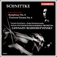 If any Schnittke issue can be said to conform to this religious criterion, it is Rozhdestvensky's recording of his two latest instrumental works, the Sixth Concerto Grosso and the Eighth Symphony. Both are clearly symbolic, not to say programmatic, pieces - although the precise nature of what is symbolised here is unspecified. Schnittke's health has been poor for many years and after finishing this symphony, he suffered a stroke (his third) and fell into a coma for three months. He has since recovered and resumed work on his opera Gesualdo (an unfinished version of which was conducted by Rostropovich in Vienna on 26th May 1995). In other words, as was true of the late Allan Pettersson, Schnittke's life is dominated by the pressing issue of mortality. Presumably, then, a central element in the religious symbolism of his current work is the mystery of death.