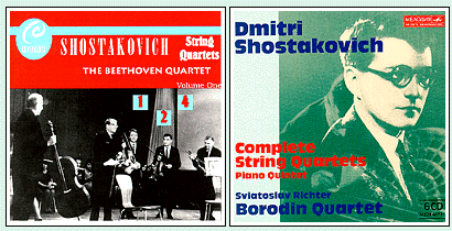 Sadly, except for searching versions of the late quartets, these recordings must be considered mainly of historical interest. There are two major drawbacks. The first is the Beethovens' fast speeds, which often give the impression of depthlessness and sometimes disrupt the structural coherence of the music (e.g., the shifting relationships of time-signature and note-value in the finale of the Ninth Quartet). This may have been due to the influence of the composer, whose speeds often tended to the hectic; there again, it might have been a by-product of recording for radio or even merely a question of familiarity breeding impatience. When Shostakovich joined the Beethovens to record the Piano Quintet in 1955, the result was a brisk 29-minute reading. Yet the same forces in 1940 [Multisonic 31 0179-2] produced a very different version nearly eight minutes longer - similar, in fact, to the Borodins and Richter in 1984. Furthermore, the later performances in this series (from the Eleventh onwards, with new personnel) calm down considerably. Indeed, the Fifteenth (recorded in 1975) is unusually slow and deliberate.