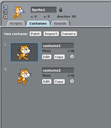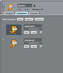 The costume pane is where you can load the costumes for your sprite. You would use costumes to animate or change the appearance of the sprite in your game or story. You can create a new costume with the built-in paint utility, import an existing costume, or use your computer's camera to take a picture and use it as a costume. On the costume list, you can copy, edit, rename, and delete the costumes. You can also reorder the costumes by dragging them into your desired order.