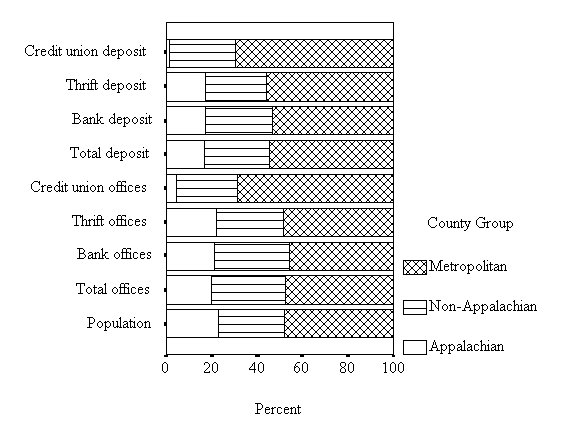 At the county level, the pattern revealed above basically holds. For example, only 3 Appalachian counties had a deposit share larger than their population share, and 12 had a share in the number of depository institutional offices larger than their population shares. The number of rural non-Appalachian counties with a share larger than their population share in the above two categories were 18 and 39, respectively. This paper does not investigate the pattern for the metropolitan counties since most metropolitan counties in Kentucky form a metropolitan market with out-of-state counties, which makes the comparison less meaningful.