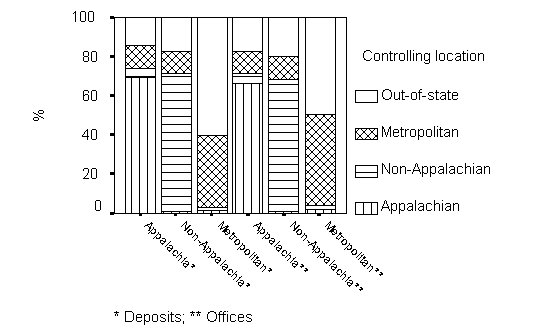 Figure 3 illustrates the controlling locations within the three types of Kentucky counties. Appalachian counties was least influenced by out-of-state institutions of all three types of counties. In addition, Appalachia as a whole was less influenced by metropolitan institutions than rural non-Appalachian counties. At the county level, a similar pattern can be seen. For example, the average percent of deposits controlled by out-of-state institutions was 11% for Appalachian counties, but 13% and 37% for rural non- Appalachian and metropolitan counties respectively. In addition, the median percent of deposits controlled by institutions outside a region --including institutions both outside a region and outside Kentucky-- was 17% for Appalachian counties, and 17% and 48% for rural non-Appalachian and metropolitan counties respectively.