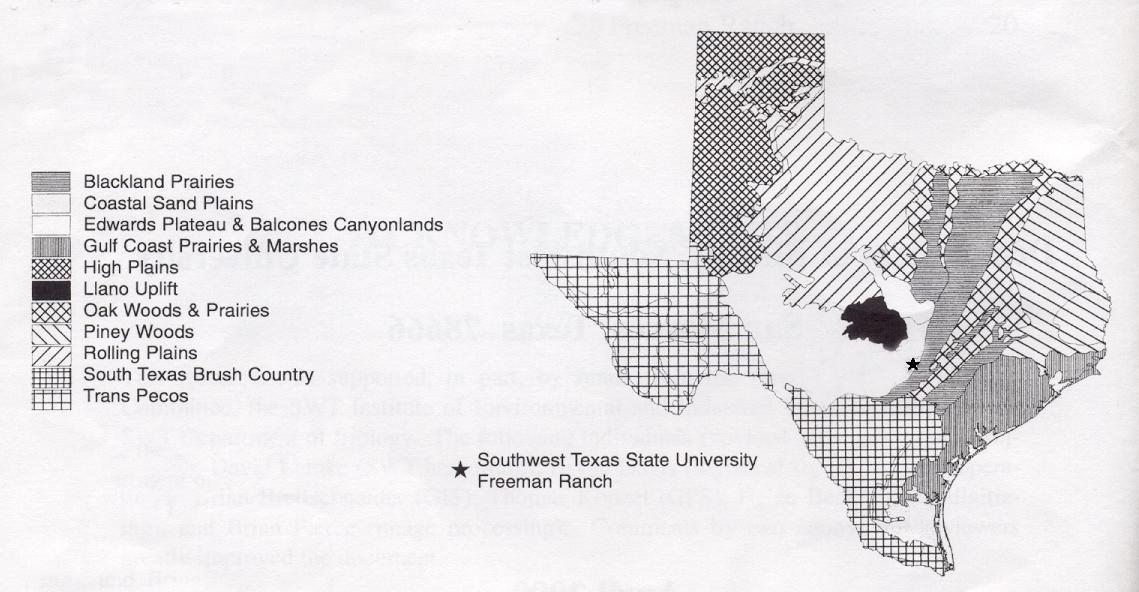 Overview of Freeman RanchFreeman Ranch is located in central Texas, approximately 5 miles west of San Marcos, Texas. The ranch consists of approximately 1,700 hectares (or 4,200 acres) and rests in the Edward's Plateau natural region. The Edward’s Plateau natural region spans across central Texas and is commonly called the Texas Hill Country. Vegetation at the ranch is representative of what is in the Edward's Plateau region. Below is a map which shows the location of Freeman Ranch in relation to the natural regions of Texas.1 In 1981, Mr. Harry Freeman designated Texas State University - San Marcos, formerly called Southwest Texas State University, as the active co-trustee of the Freeman Ranch. Since 1985, the university has overseen operations at the ranch. Mission of Freeman RanchFreeman Ranch, which is a working ranch, serves as a model in ranch management and as a place for educational outreach and research. Livestock of the ranch include cattle, sheep, and goats. Each year, many teachers and students visit the ranch and participate in educational activities. Researchers and students also visit the ranch regularly to conduct experiments and studies at the ranch. In addition to these activities, the ranch rents out stalls to horse owners, cares for and trains horses, and leases land for hunting of wild game, primarily white-tail deer. |