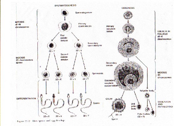 - Gametes (egg and sperm) have 23 chromosomes instead of 46 due to special reductive cell division during gametogenesis: meiosis (chromosome number reduced by 1/2)