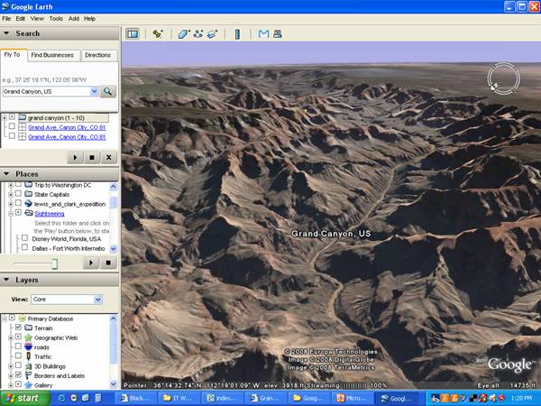 Fly To Panel —You can type in a full address or a city or state. Places Panel— You can create folders and create a tour. Or take the Google Earth Sightseeing Tour. Layers Panel — By selecting different layers you can see things like the terrain in 3-D, State Lines, Highways, 3-D buildings or different landmarks. |