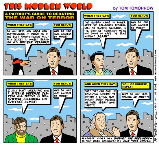For this assignment, you are going to analyze how the particular components of a specific argument work together to persuade or move an audience. The above political cartoon, by Tom Tomorrow, published on April 3, 2002, is a type of argument that uses humor to persuade its readers, but what point, or points, exactly are being argued, and who is the likely, intended audience? [The cartoon is actually very complex and its argumentative points are not easy to summarize.] Your main objective in this essay will be to describe and evaluate an author's success, or lack thereof, at [page numbers refer to Everything's An Argument]: