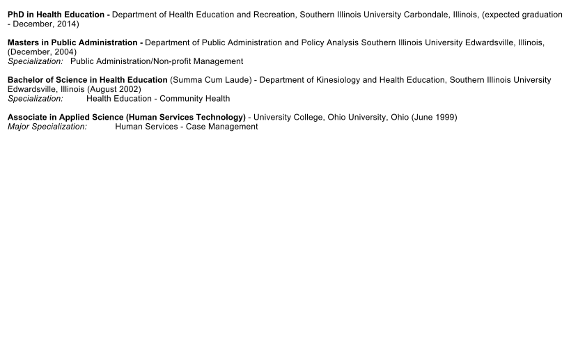 PhD in Health Education - Department of Health Education and Recreation, Southern Illinois University Carbondale, Illinois, (expected graduation