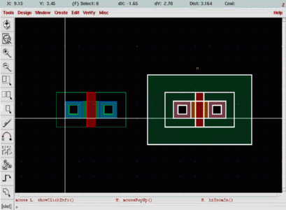 You can drop the selected object (in this case consisting of the n-well, the p-active, poly and contacts) into its final location by clicking once on the left mouse button.