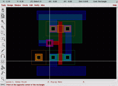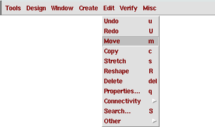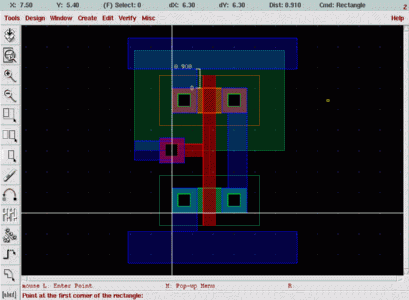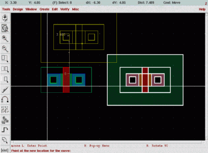 We will be asked to find a reference point for the object to be moved. The cursor will practically grab the object from that reference point. Since we want an accurate placement, it is advisable to select a point for which alignment is simpler. The corner between the diffusion and the poly is a good place to grab the PMOS.