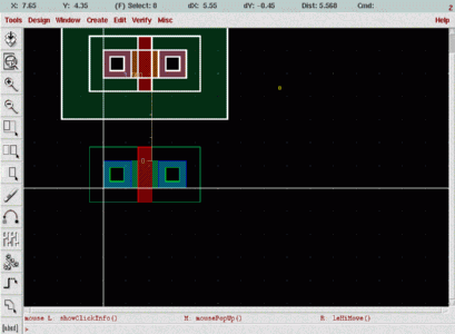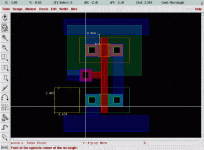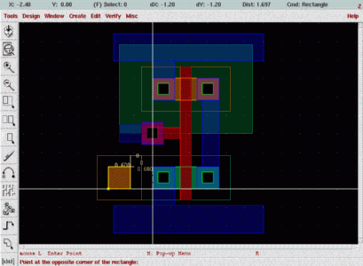 3. Draw the active contact square inside the p-type active area. Select "CC layer". Draw a square 0.24um X 0.24um and it should be 0.12um from the edges of the pactive square.
