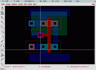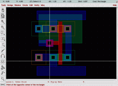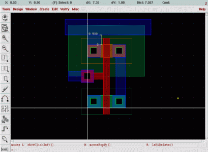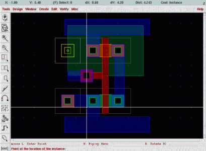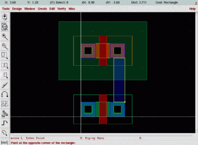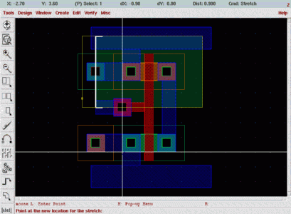 In this example, we did not pay much attention to the location of the transistors while building them. As long as the design rules are not violated, the transistors can be placed in any arbitrary arrangement. Yet based on our original signal flow diagram, it is more desirable to place the PMOS transistor directly on top of the NMOS transistor- for a more compact layout.