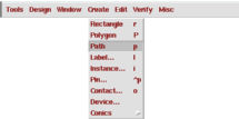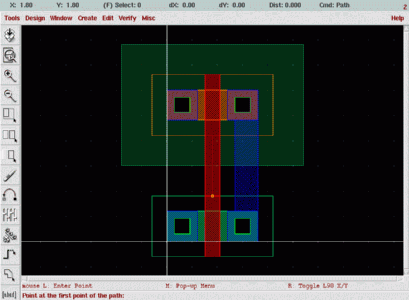 This connection can be done manually by drawing a poly contact layer between Metal-1 and poly, but we will use the path command to automatically add the contacts.