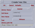 Enter the name of your cell for which you will draw the schematic. In our example, we will draw the schematic of an inverter, so we type "inverter" in the Cell Name field.