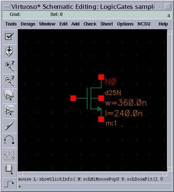 If you move the mouse cursor on the schematic window, you will see a bright NMOS transistor symbol moving with the mouse pointer showing the gate terminal of the transistor. At this point, you decide where to put this transistor. Click on a location in the schematic window, where you want to put the transistor. Please refer to the images below to see a “placed transistor".