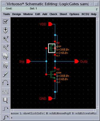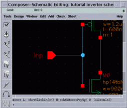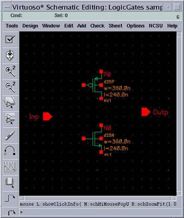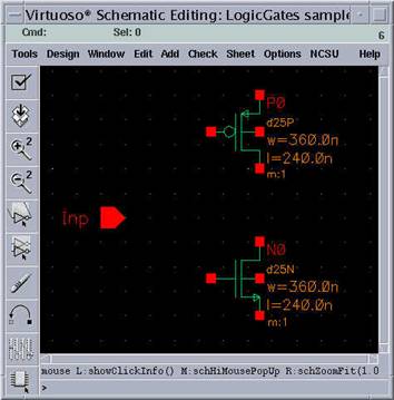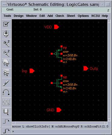 Now, you have your input pin with the name "Inp" floating in the schematic window. Point to a location to place the input pin. Since the input is the gate terminals of both transistors, it is more convenient to put this pin in front of the common node of these terminals.