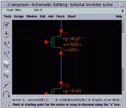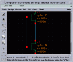 Since we begin with wiring the VDD and the source of PMOS, we click first at the center of the red square which corresponds to the source of PMOS net.