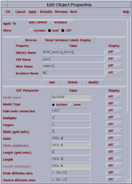 You may change the values for Width or Length depending on your design specifications. Usually, you will change only the Width value, which stands for the channel width, W. The default values for these properties are the smallest available values which are determined by the current technology.