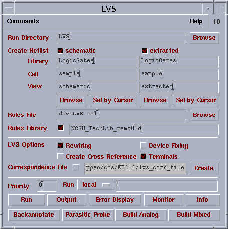 Although there are a number of options for LVS, the default options will be enough for basic operations, select Run to start the comparison. (Note: The Library name in the figure shows as LogiGates but we would use our library “ece484Lib”)
