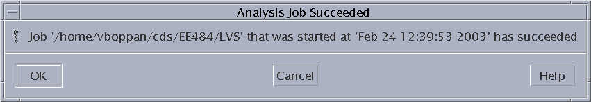 The comparison algorithm will run in the background, the result of the LVS run will be displayed in a message box. Be patient, even for a very small design the LVS run can take some time (minutes).