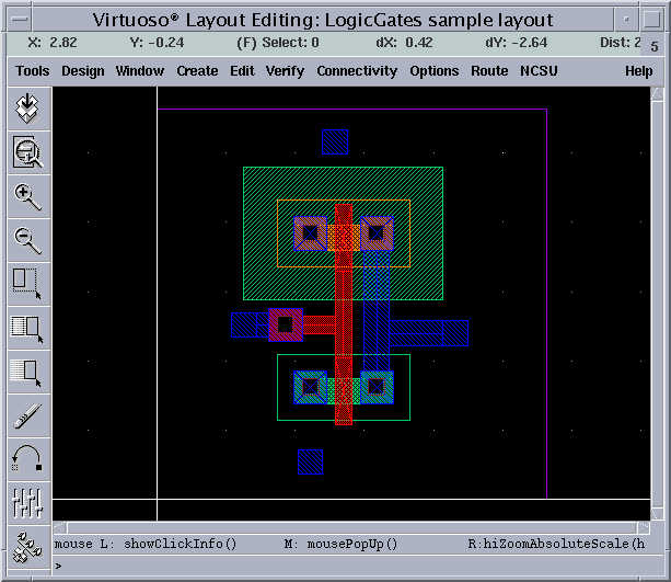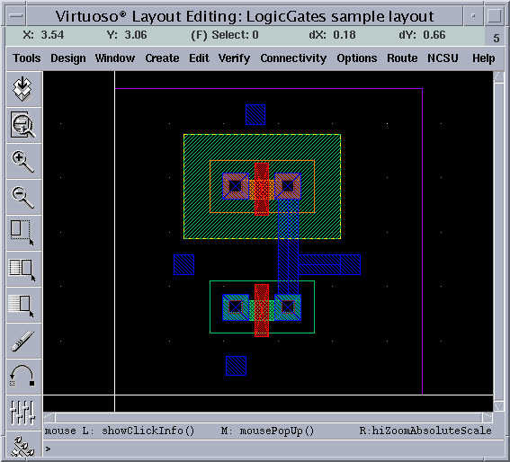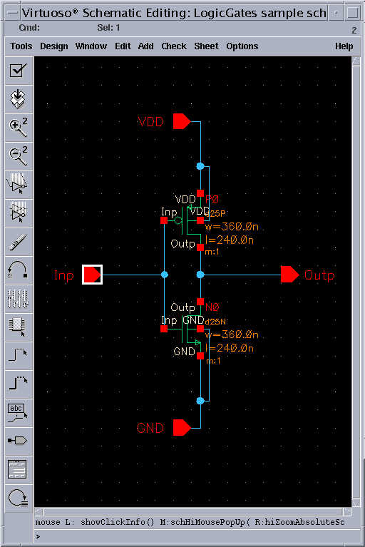 As an example try clicking and selecting the Input pin connecting the gates of both transistors , notice that Input pin "Inp" in the layout window will be highlighted.