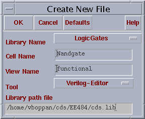 For the functional (verilog) view of the 2-Input nand gate, open a new cell view. In the field cell name, give the same name what has been given for the schematic of 2-Input nand gate. In The tool field, select verilog editor from the drop menu. Enter the view name as “functional”.
