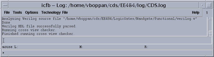 After this, to save and compile the verilog file, press shift :wq on the keyboard. This will save the file and also will compile the verilog code to find any syntax errors. The errors will be listed in the icfb window. The figure will be shown as below