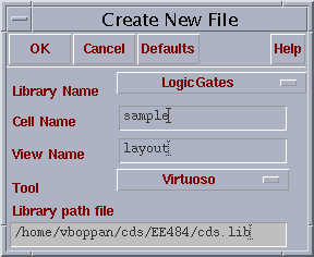 Up on selecting "Create New" a dialog box appears and will let the user select the cell name for the layout. It is a good idea to use the same cell name that the schematic has and specify layout as the cell view name.