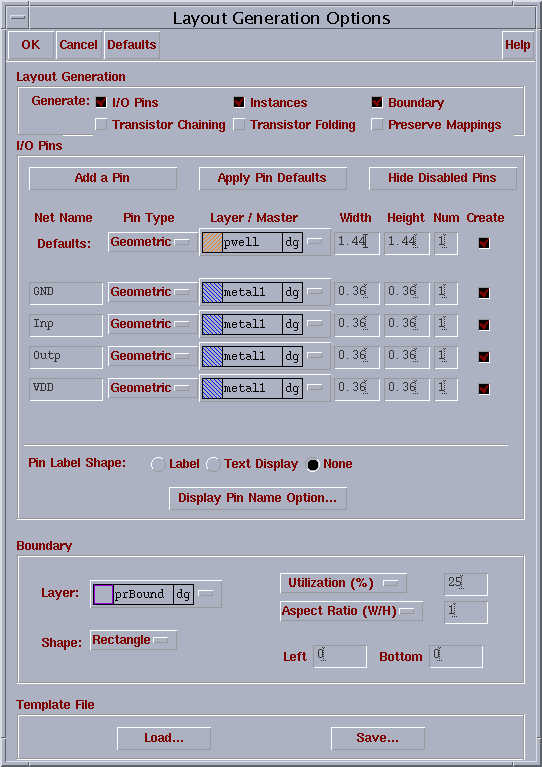 These three windows define the working environment for the automatic layout generation flow. If the names of the pins have to be listed on the layout window, Select "Label" and "Display Pin Name Option", the names of the pins will be displayed on the layout.( But do not do that because it gives "Design Rule Check Errors")