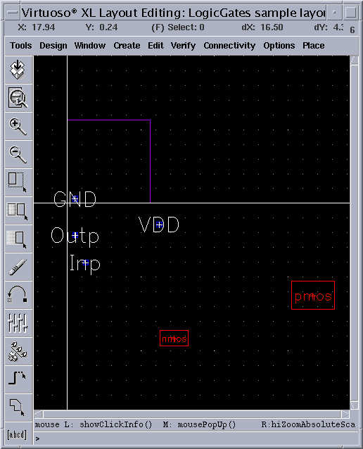 After the I/O pin layer is selected, two rectangles representing the transistors (the nmos and the pmos) and four Metal-1 squares will show up in the bottom half of the layout window. Notice the cyan colored square on the upper half of the layout window: This is the estimated size of the layout, this size is not mandatory, it is calculated roughly from the sizes of the active elements.( The window which you get will be different from what is shown below. Your window will not contain the label names of the pins. that's ok)