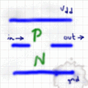 The schematic will the contain exact connection diagram and individual device properties. A example inverter schematic can be seen below. The schematic drawn in a way to resemble the final layout.