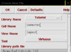 A dialog box will appear prompting you for the design library, cellname and cellview. Make sure that the library name corresponds to your design library i.e "LogicGates" , choose a name for your cell i.e "inverter" and choose Virtuoso as the design tool. The cellview will be selected as layout.