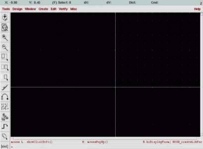 Virtuoso is the main layout editor of Cadence design tools. There is a small button bar on the left side of the editor. Commonly used functions can be accessed by pressing these buttons. There is an information line at the top of the window. This information line, (from left to right) contains the X and Y coordinates of the cursor, number of selected objects, the traveled distance in X and Y, the total distance and the command currently in use. This information can be very handy while editing. At the bottom of the window, another line shows what function the mouse buttons have at any given moment. Note that these functions will change according to the command you are currently executing.