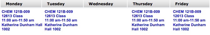 again. First, round up each day to the nearest hour. Next, add up all the seat time. When we do that, you can see that Chemistry 121B (the second semester chemistry lecture class) should be be worth 4 credits. If we checked CougarNet, we would find that CHEM 121B is, in fact, a 4-credit class. |