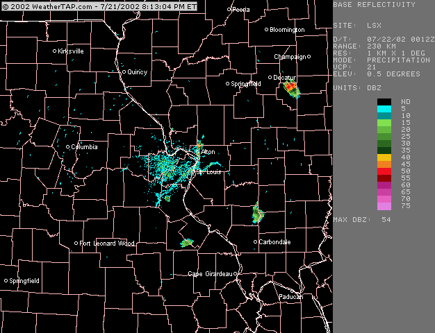 The last hour or so of this process can be seen in this radar loop from 7:12 - 8:05. The refineries are located just east of the bend in the Mississippi river northeast of St. Louis (below and just to the left of the "A" in Alton on the radar map). Note that there are two other areas of similar more or less stationary convection, one in Jefferson Co. south of St. Louis and another east of Decatur, IL. I do not know if there are any similar man-made features that may have contributed to convetion in these areas.
