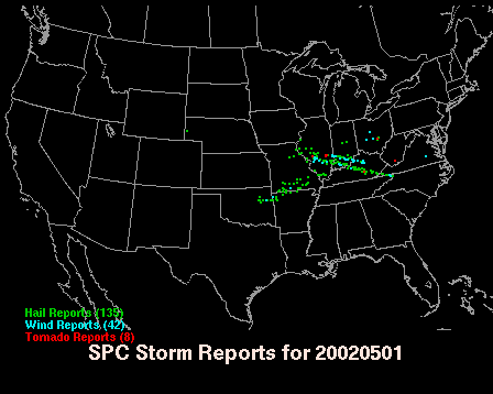 This storm did not look potentially tornadic when I left home (see 1 p.m. radar link above), and it had no warning of any kind for the portion of it in Madison Co. when the damage began in northeast Madison Co. It went from an ordinary looking storm to an obvious supercell (see 2 p.m. radar above) in a matter of minutes. When I first wrote this, it was 8:30 p.m., and the storm was still going and still causing tornado warnings somewhere in Kentucky. Even at 11:30 p.m. the storm was still going, but had evloved into an MCS. By then, it was in north-central North Carolina! As this map from SPC shows, this storm caused a near-continuous streak of severe reports from just north of STL to the Tennessee-North Carolina state line.