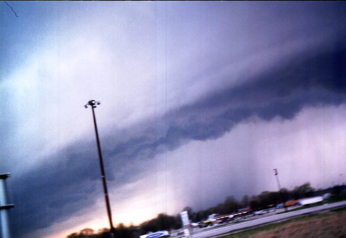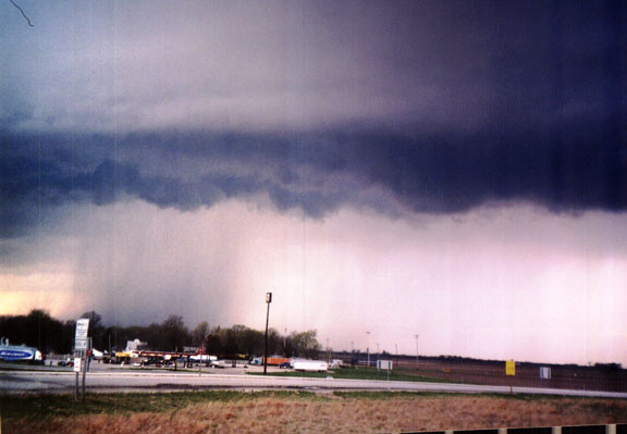 Now, the storm was evolving rapidly into a squall line. I stopped for a quick pit stop at the rest area near the Taylorville exit, and there were several people who had driven through the storm who were really freaked out by what they had come through - intense hail and low, rapidly moving clouds. Some thought they had seen funnel clouds, but if so, that must have been farther north. I watched the storm passing to my north, and though becoming more linear, it remained intense, as can be seen on this radar image from just before 5 p.m. Note also on this image the very intense cell in Clinton Co., to the ESE of the St. Louis area. This cell, associated with the cluster that passed just south of Edwardsville, produced a tornado near Bartelso, IL minutes after this radar image was captured.
