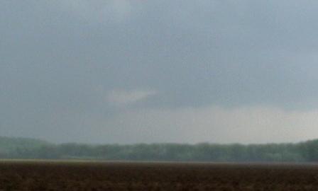 To get to Rich Fountain, I had to cut south on U.S. 63, then east on route E. It was, incidentally, obvious that I would get totally cored and probably encounter some serious hail if I continued east on route 50 - both this observation and the new radar report indicated that the storm continued to move SE. By the time I got headed east, it was obvious that the meso had wrapped up in rain and if there was a tornado with the Rich Fountain meso, I was not going to see it from this direction. In fact, both the first storm I was on and this one seemed to be cycling, with one meso wrapping up in rain, only for a new one to form to the south or southeast. This, I think, accounts for the southeastward movement of the storms, especially considering that the radar often indicated eastward movement based on the movement of the main areas of precipitation. Looking at the map, I saw that a couple miles east of Rich Fountain there was a south option, which might let me get a better angle on either the now rain-wrapped meso or any new one that developed under the updraft base to my SE. And it looked like that was a possiblity, as small lowerings like this one were visible to my SE at a stop near Rich Fountain. Although this looks a little like a funnel cloud, I could not see any rotation. I hoped the storm would get east just enough that I could make it to the south option without getting cored, but that was not to be. As I tried to nudge the backside of the wrapping precipitation, I encountered hail that quickly grew in both amount and size. Seeing the trend, I stopped and turned around in a dense barrage of mostly 1/4 to 1/2 inch hail, but a few dimes mixed in. This turns out to have been a good decision; this was a little after 6 p.m. and at this time, golfball hail was reported just 4 miles or so north of my location.