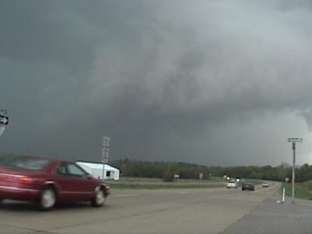 Gradually, the meso came closer, but did not show any indication of being about to produce a tornado. Still, I did not want to let it pass right over me (or just to my south, which would put me in the hail core), so I knew I needed to bail south. I turned around on the road I was on and did so; fortunately the road was just in the right place to let me thread my way toward the small bright spot between the updraft of the storm to my west and the rapidly intensifying updraft of the one to my SE. Somewhere around or just south of Lake Mykee, I think a little before 5:00 p.m., I stopped again and watched the meso, which was both shifting to the SE and changing in form to look less like a wide wall cloud and more like a shelf cloud as precip began to punch in behind it. It did, however, have a very impressive inflow tail at its north end. I did not catch the locations, but a SVS at 4:48 placed the radar-indicated tornado near New Bloomfield (where I had just been), with a new tornadic radar signature on the next storm SE, near Wainwright. The latter was described as moving NE and the former continuing to the E, so it was a matter of time until these two storms merged. Soon I moved south once again, stopping a mile or so south in a parking lot. At this time the meso was almost over me, and I noticed a small area of weak rotation in the clouds perhaps a mile to my W. I got a little more video, including this shot of the north end of the lowering almost overhead, then bailed to route 54 and ducked south to get out of the path of any possible wrapping hail. At 5:10, another chaser reported golfball hail at Lake Mykee, where I had been minutes earlier.