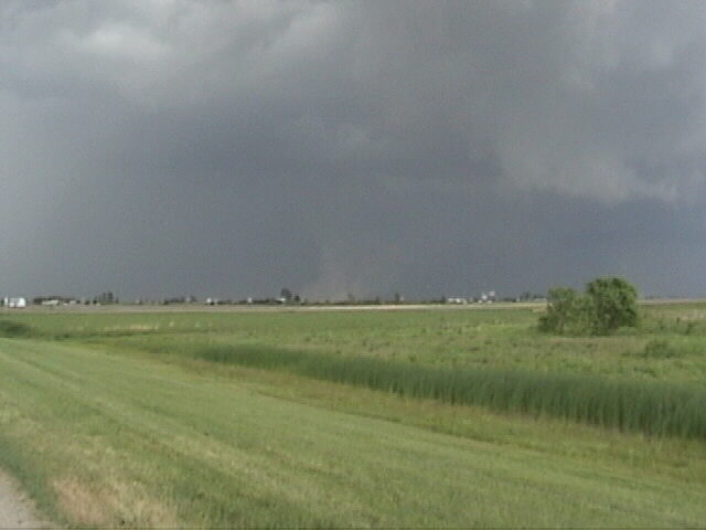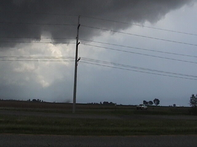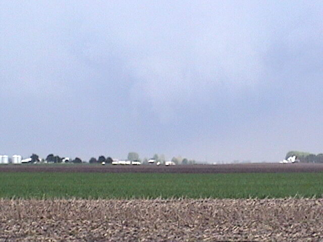 After this feature dissipated, I also got video of a large RFD dust plume and a lowering off to the SE that may have been associated with the Beason or Midland City, IL tornado, but that was too far away to tell. Here is a video capture showing the distant wall cloud and dust plume - note the lowering on the left side of the wall cloud - funnel? It is also worthy of mention that, while I was taping the swirl from the north side of I-55, there was a wall cloud in the background (visible in the first two video captures above), which might be associated with the tornado reported southeast of Atlanta - though the tornado itself is not visible. Both of these wall clouds are likely the same one, probably about 5-7 minutes apart.