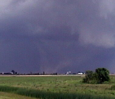 That strategy was out the window almost as soon as I developed it. Looking north toward the storm, I noticed a very large cloud of dust. I would estimate the time around 3:50, but I am not sure of the exact time. At first I thought outflow-related dust plume, but I soon had my doubts - it went up very high, and the highest part in the center seemed to go straight up. Could it be a tornado? It obviously was going to cross the highway, moving SE as it likely was. Fortunately, I was approaching the business route 55 (old route 66) exit NE of Lincoln. I could get off before it crossed the highway. As I crossed over old route 66 and headed for the exit, I could see the large dust cloud crossing old route 66 no more than a mile north. I actually thought about stopping along the ramp but there was no place to safely do so, so I got off as quickly as I could and crossed under I-55 to get on the north side where I could see and videotape the dusty feature - I still was not sure whether or not it involved rotation. As I went under the underpass, I noticed at least a half dozen cars stopped underneath to take shelter and at least one person out of the car, apparently heading for the girders. Besides the fact that this is not generally a good idea, this looked especially silly because this location was not in the path of the feature I was obseving.
