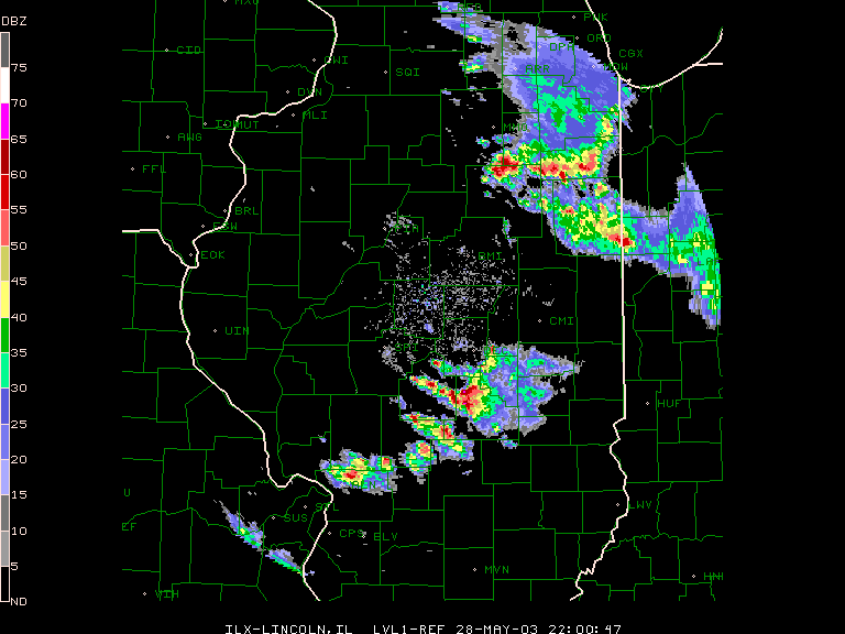 By the time I reached Litchfield, I had heard about a blue box for Sangamon and Christian Counties and points north. I stopped briefly at the rest area near the Taylorville exit and checked radar on the DTN system. The cluster of storms SE of the Quad Cities had now morphed into one monstrous storm that looked supercellular and looked to be near or just NE of Peoria. The Springfield NWR was reporting the strongest storms near or just west of Peoria. By the time I got close to Springfield a little before 3, I could see lots of towers and anvils to my north and NW. By the time I was most of the way through Springfield, I could see I was getting close to one of the storms as the sky to my northwest was becoming very dark, and I could see some updraft base off to my NE. Hearing no warnings, I decided to see what was going on farther north and managed to tune in the Peoria NWR - and immediately heard an update on a TOR warning that had already been issued for Tazewell and Woodford Counties, based in part on an actual spotter report of a tornado.