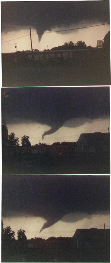 Marion, Illinois Tornado - The May 29th, 1982 Marion, Illinois tornado. The top photo in this set of 3 photos is looking east toward Marion. The tornado is near the intersection of I-57 and Route 13. The middle photo is from the same location and the bottom photo is of a home, just moments after the tornado completely leveled it. Keep in mind, this picture was taken before anything had been cleaned up --there was nothing left, except foundation. In this photo, the tornado has widened. This tornado was rated F4 and caussed 10 fatalities and many injuries. Photos by Brent Beasley.