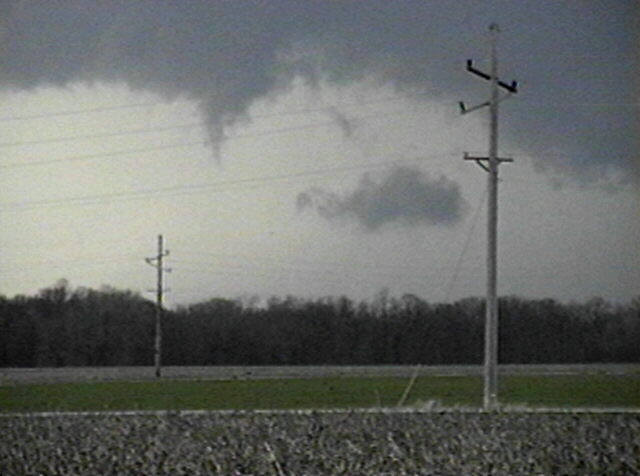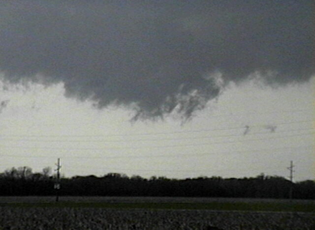As I got in the car, KMOX was finishing up the process of announcing a tornado warning for Macoupin Co. - my storm! As the warning below indicates, St. Louis NWS had a TVS about 5 miles W. of Carlinville at 4:45 - the approximate location of the apparent large, partially rain- wrapped funnel I had seen. My only way northeast was to proceed into Carlinville and then head east, which I did, on IL route 108. Now the storm had gotten ahead of me and was both north and east of me - it seemed to be moving faster than before, which is confirmed by the NE at 35 movement indicated in the tornado warning. I figured I could head east then catch up with it by heading up I-55, but there was one problem with this - it was now about 5:00 and I was supposed to meet someone in Edwardsville at 5:30. I grabbed my cell phone and cancelled that. As I headed east, yet another lowering formed under the updraft which was now to my NNE. This may have been the most impressive of the day, a narrow lowering that reached 80 percent of the way to the ground. I could not verify rotation, so I would classify it as a "likely funnel" based on its appearance, but cannot say that with 100% certainty. In any case, it was every bit as awesome as it appears in the picture. I did not hear it at the time, but I found out later that, around this time, the Lincoln, IL NWS office issued a tornado warning for Southern Sangamon and northern Christian Co. based on a TVS around this general location. The lowering got shorter but wider, and to its right, too far away to see well, was what appeared to be a front-lit lowering extending almost to the ground. It appears as a lighter colored lowering on the right of the picture. However, given the rapidly increasing distance between me and the storm as it got farther and farther to the north of me, part of the latter formation could have been a sunlit rain or hail shaft. By now, I was in anvil rain from a rapidly intensifying storm to my SSW. Both to avoid getting hailed on by that storm and to try to catch up with the other one, I headed north on I-55. But the storm had too good a lead on me, so I gave up after two exits. By this time all the lowerings had disappeared, but the storm had developed what may have been an RFD notch. But seeing no more lowerings and being well-behind it, I gave up, as I was really needing to get home because of evening commitments.