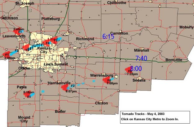 A damage survey from NWS-EAX for the first Johnson-Pettis storm can be found here, and a map showing the tornado tracks and times, with my positions and times shown in blue print, can be found here. A listing of local storm reports from the Kansas City (EAX) NWS office is also available.