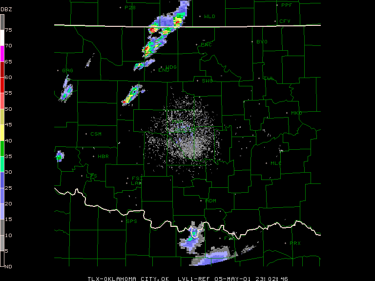 8:30 – I briefly chat with fireman as I turn east. He says he saw tornado and is debating closing the section road I have turned on to, but decides it is safe. Spotters have reported tornado 6 NE of Cordell at 8:23. As I head east, I hear that the storm just S of Cordell has intensified and now capable of producing tornado. I have noticed quite a bit more lightning to the S in the past 10 minutes or so, and as it is getting dark, I decide to work back to the main road and head north to Clinton for the night, rather than chancing getting caught by the next storm. New TOR is issued for Custer Co. as the storm is moving out of Washita Co. and toward the town of Weatherford.