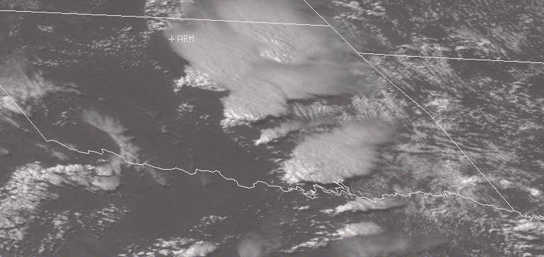 5:05 – In Sand Springs, just past where 97 meets 412, storm is just to my N. It is incredibly dark, and puts down a strange shelf cloud-wall cloud hybrid. It looked like largely an outflow feature, but it also was under a strong updraft and was lower than the surrounding shelf-cloud feature. It also showed some rotation – the lowest part surged to the ESE while cloud tags just behind moved NW. Hail shafts could be seen to its N and NW and pitch darkness under it to NE – very intense precip. Later, I learned that 3/4-inch hail covered the ground about 5 miles north of my location around this time. Also around this time, this mesoscale discussion is issued by SPC, though I did not hear it at the time. Here is a satellite image from around that time.