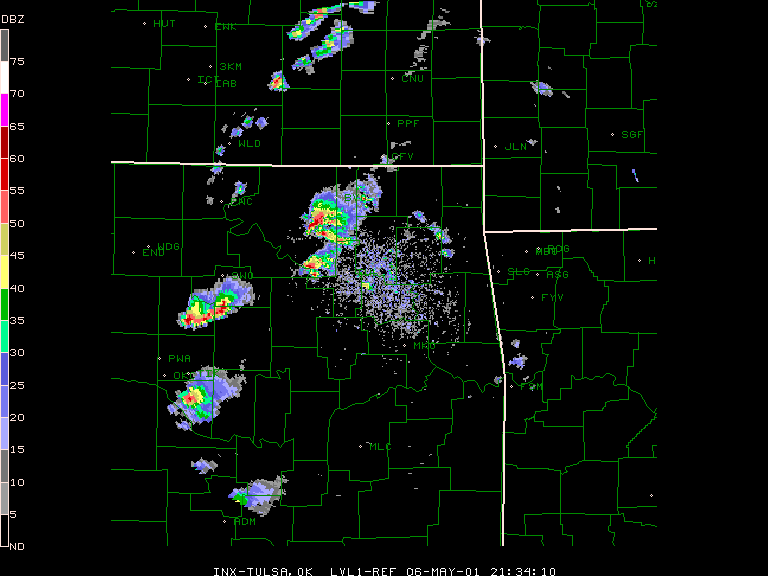 2:15 - I blast back W to Okema, then on 62 NW to 48. I see a lot of darkness and some anvil spreading over the sky to the west, and other storms firing to N and far NW. I double back and forth a couple times on 48 and W to Gypsy. Finally after an hour or more of indecision, I realize that the storm to my SW is still far away. (Actually, it turns out it was all the way back near Norman.) With lousy visibility (woods and hills) and poor road network, I can't go to it, and if I wait for it I will be there a long time. Meanwhile, I see a very impressive cluster of storms up near TUL and am hearing SVR warnings for Osage Co. I decide to commit to these storms.