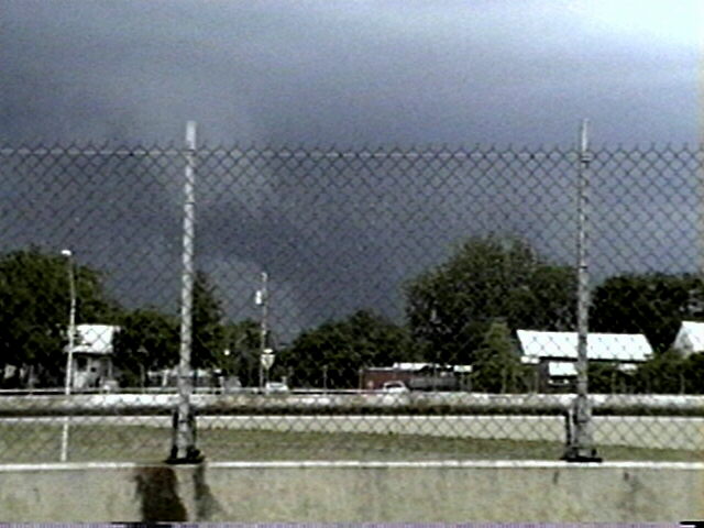 8:15 – As I pass thru Cordell, chasers converge from every direction to chase N. I pull over for a moment as a police car with sirens blaring speeds toward the reported tornado. My plan had been to head east from Cordell, and had I done that, I might have gotten a better look at the tornado. But I foolishly went with the crowd of chasers blasting north. As I am near the center of town, I see a pinkish, funnel briefly - I think this was the upper part of the tornado; the lower part hidden behind trees and buildings. I stop again briefly in a parking lot in town and shoot some video, but at this time I cannot spot the tornado again. However, upon later reviewing my video, I have discovered that I did indeed get the tornado briefly on video at this time! The contrast is very poor, but the tornado can definitely be seen in this video capture. It is above the sloping part of the white roof, between the two poles. Here is an enhanced version of the video capture - it's more grainy, but the tornado is easier to see. Sometime while I was in the town - can't recall exactly when, a second or continuing touchdown is reported about 4 miles NNE of town.